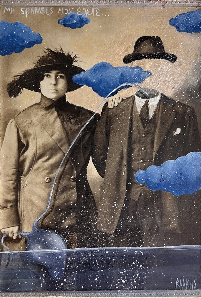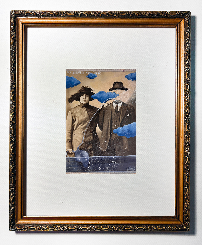 Η γομολάστιχα. Μη σβήνεις μου έλεγε… Έργο ζωγραφισμένο με ακρυλικό πάνω σε φωτογραφία του 1900, είναι τοποθετημένο σε αναπαλαιωμένη κορνίζα του 1940.