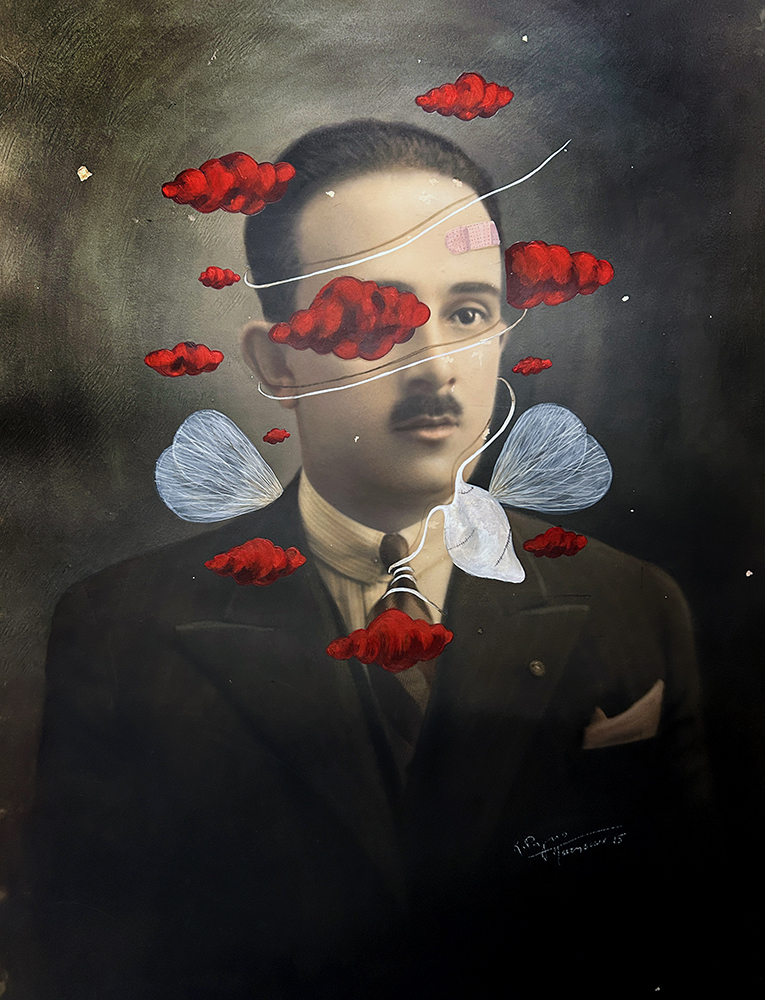 Κόκκινα όνειρα. Έργο ζωγραφισμένο με ακρυλικό πάνω σε φωτογραφία του 1940, είναι τοποθετημένο σε αναπαλαιωμένη κορνίζα του 1940.